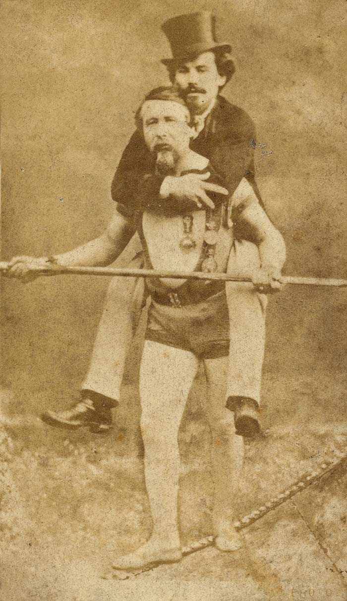 Blondin walks a quarter mile across a tightrope blindfolded, pushing a wheelbarrow. The crowds cheer until he invites a volunteer to hop in the wheelbarrow for him to do it again. The crowd goes quiet, no one accepts the invitation. However, in August of 1859 his manager, Harry Concord, climbed on Blondin’s back and rode across the falls.